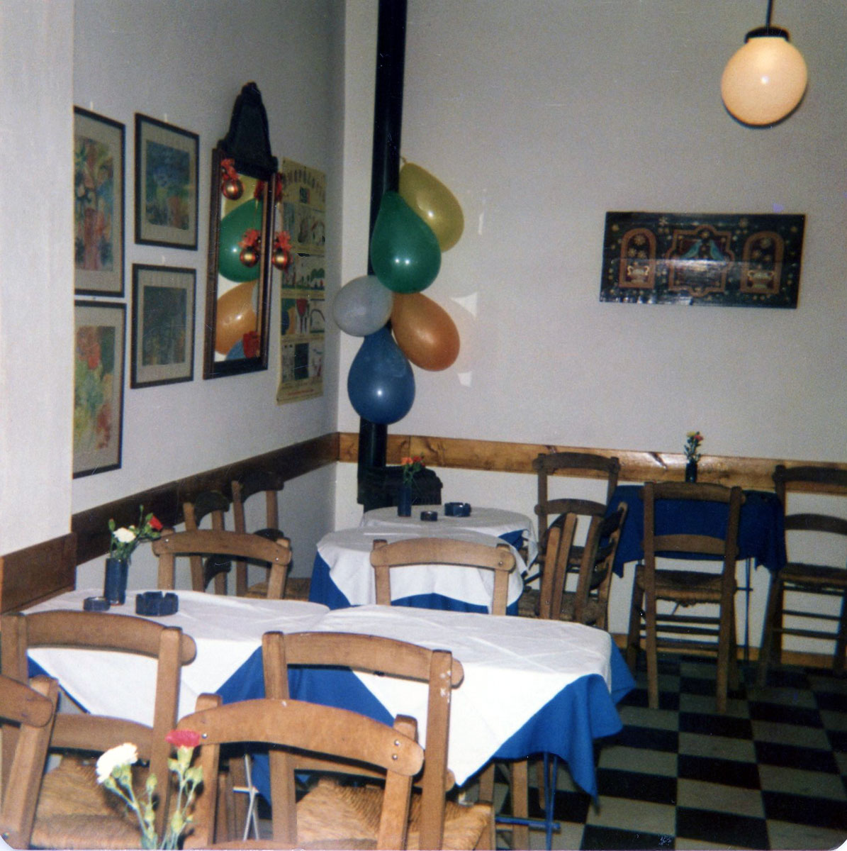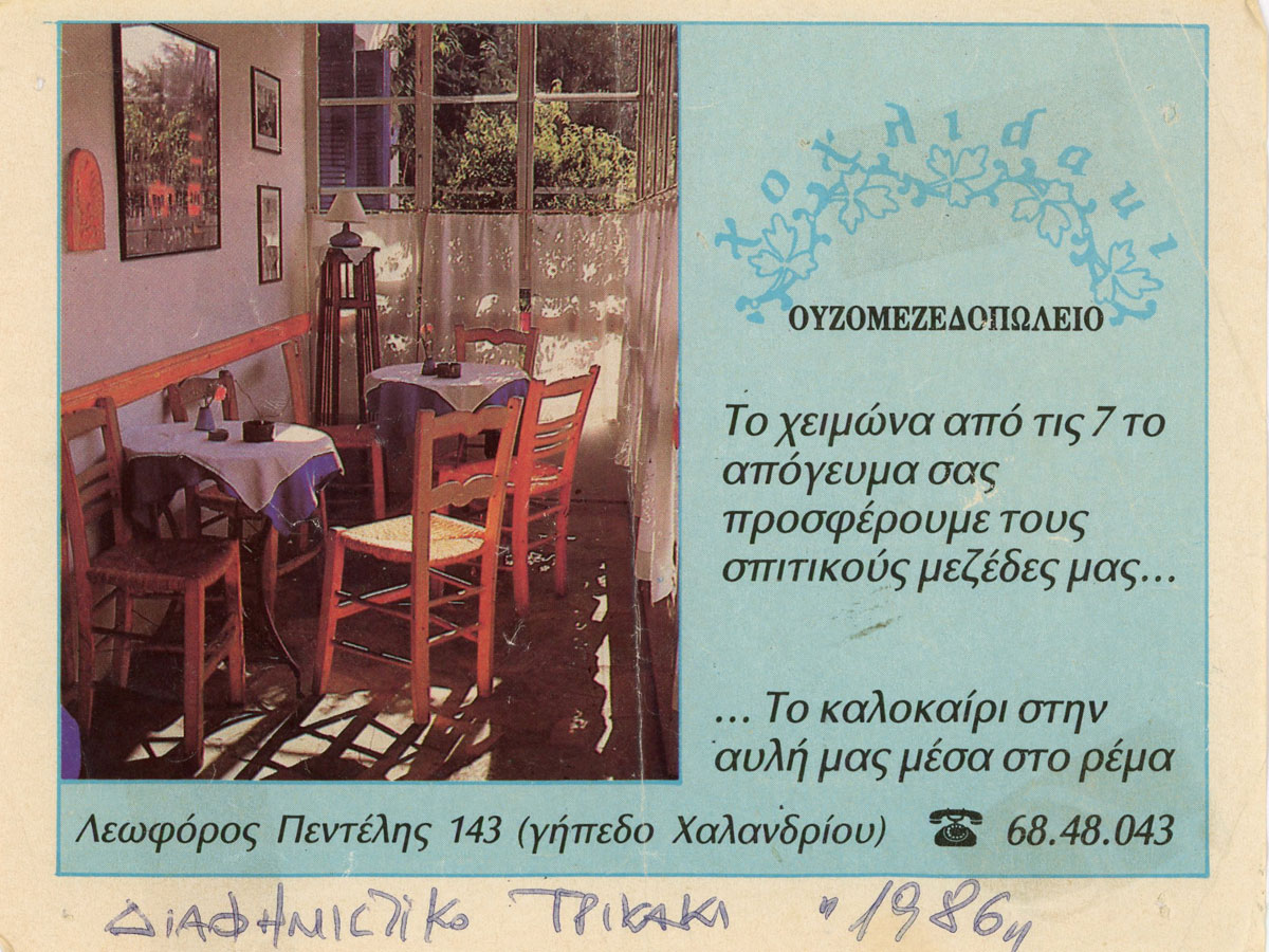 Πιάνουμε ένα μικρό σπιτάκι, στις όχθες της ρεματιάς στις παρυφές των Βριλησσίων. Ενεκα που δεν υπήρχε σάλιο, επιστρατεύονται φίλοι, και συγγενείς. Βάφουν, χτίζουν, στολίζουν, τα πίνουν, και εγένετο το άσπρο σπιτάκι με τα μπλε παράθυρα, και την θεϊκή βεράντα πάνω από το ρέμα. Με έναν οικιακό απορροφητήρα, μια ηλεκτρική φουφού και μια ξυλόσομπα, ξεκίνησε το ταξίδι στις κουζίνες του τόπου μας, με πρώτο σταθμό την Πόλη. «Κλέψαμε» τα κολοκυθάκια μπαστουνάκια από την γιαγιά Ιπποδάμεια, τα τζιέρια από την Ευθυμία, τα σουτζουκάκια με τις ελιές και τα κιοφτεδάκια από την Φωφώκα. Στα εγκαίνια η γιαγιά μου η Κατίνα τύλιγε ντολμάδες, μα τελείωσε το τύλιγμα αφού τέλειωσαν τα εγκαίνια: «εργόχειρο είναι αυτό μπρε, τι θέλετε να κάμνω, δυό χέρια έχω». Το χταποδάκι στη Φουφου δεν ψηνόταν με τίποτα, ενώ ούτε ως σερβιτόροι η οικογένεια έλεγε και πολλά πράγματα… κοντολογίς, καταστροφή!